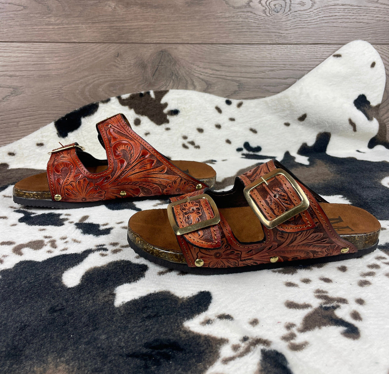 Beautiful handmade hand tooled leather double strap sandals - Size 8US models JJWesternAccessories
