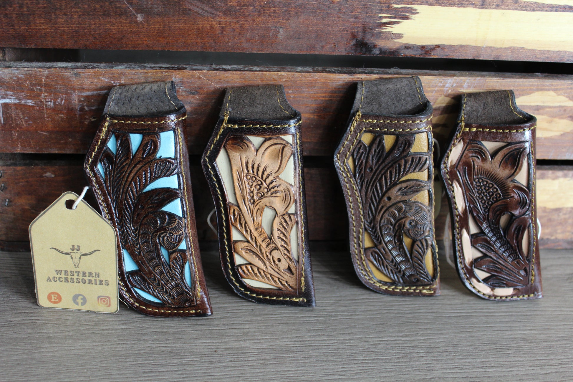 Brown Leather Sheath Hand Toodled Knife Holster, Funda de Navaja Cincelado